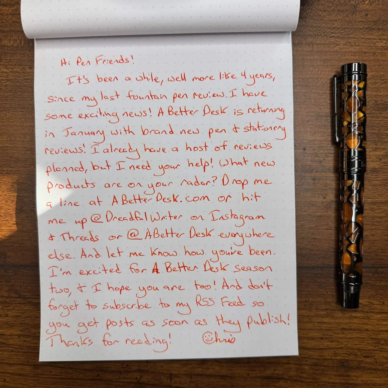 It's been a while, but I'm so excited to announce that A Better Desk is returning for a second season in January 2026! I have a ton of fun reviews planned, and I'd love recommendations for new products to review! You don't have to wait until 2026 for more ABD goodness. I'll be posting ABD greatest hits through the new year, and you can follow along on your platform of choice, X, Threads, Bluesky, or my personal favorite, Mastodon. Crazy to think that most of these platforms didn't exist when I posted my last pen review :-) And don't forget to follow the blog RSS feed to so that you receive new posts as soon as they are live in 2026!